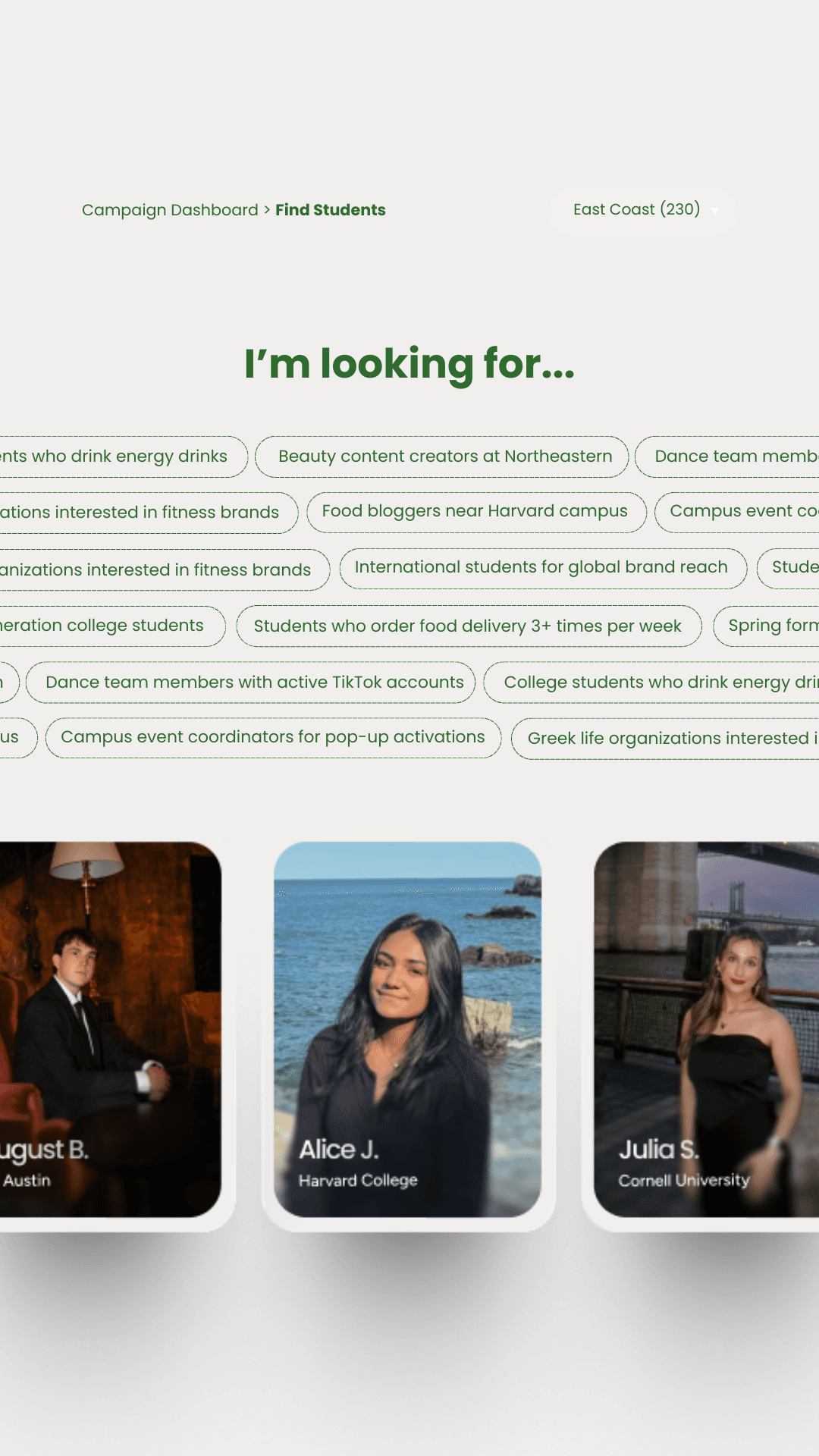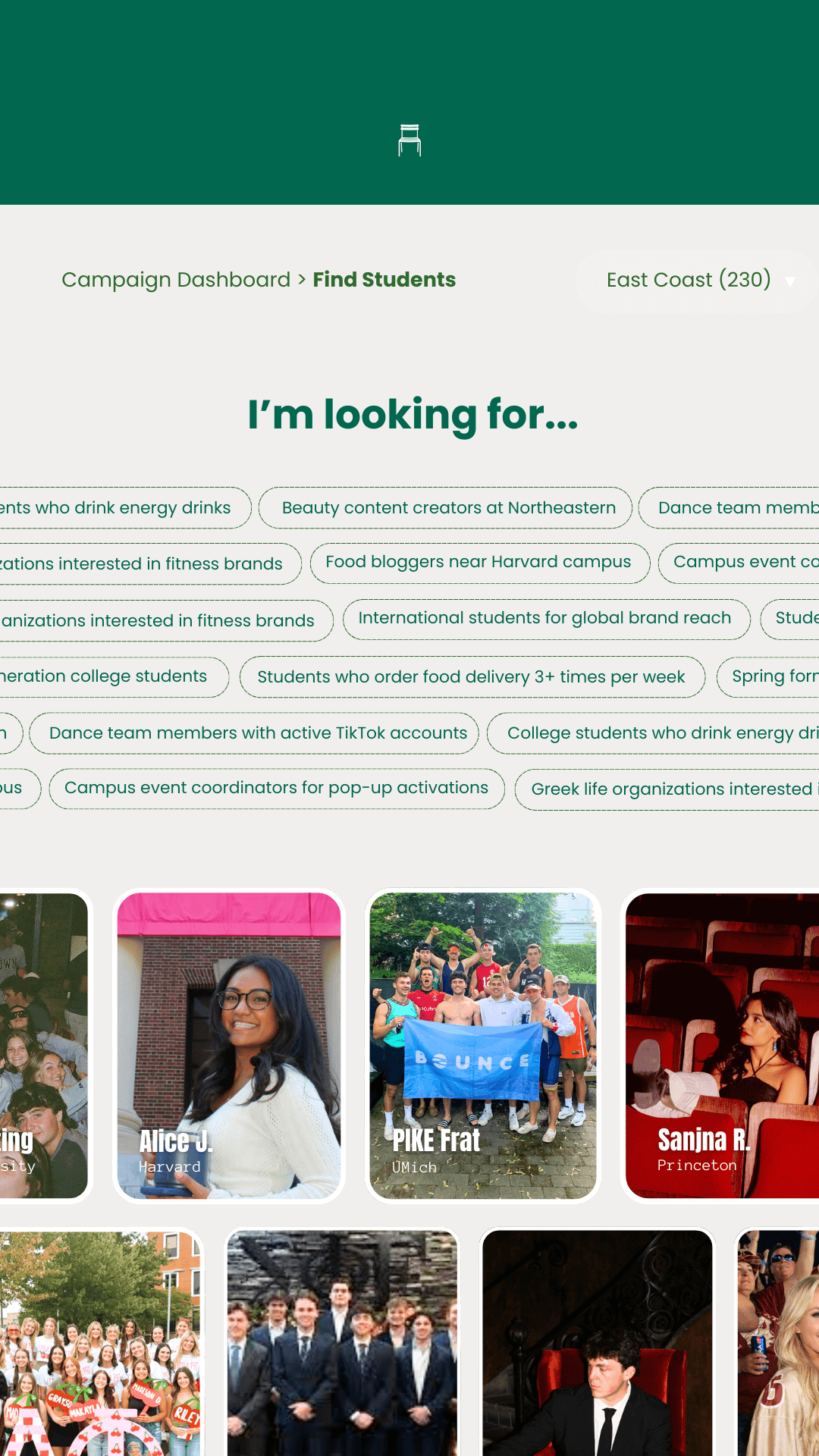 Algorithm that matches brands with students based on campus culture and local trends, not just follower count. Get authentic creators who actually resonate with your target campus community.
